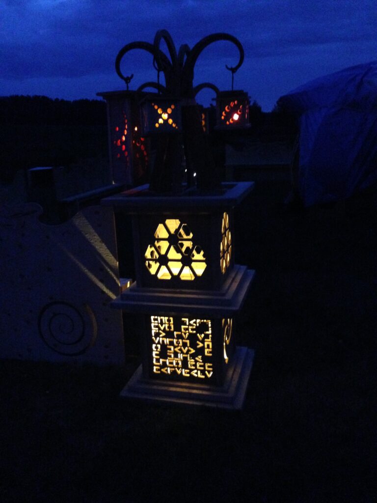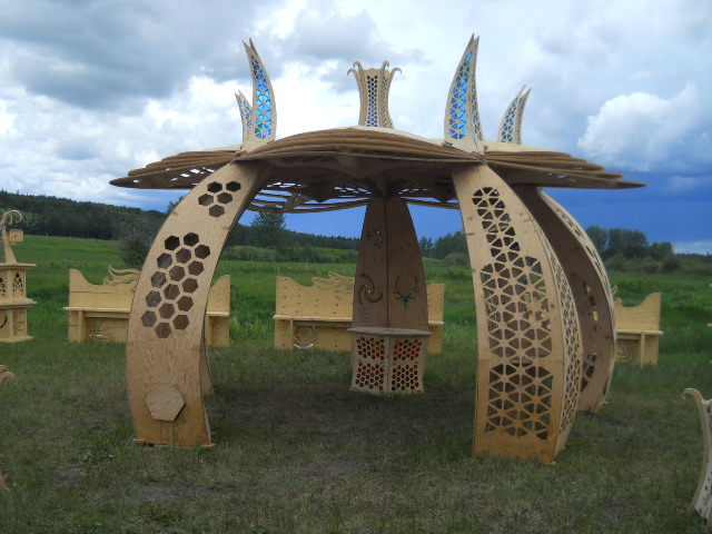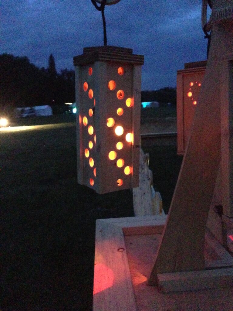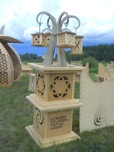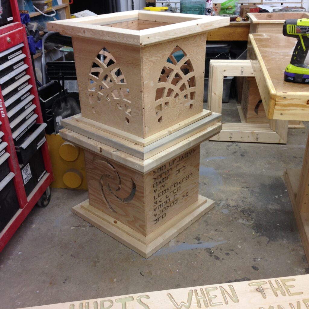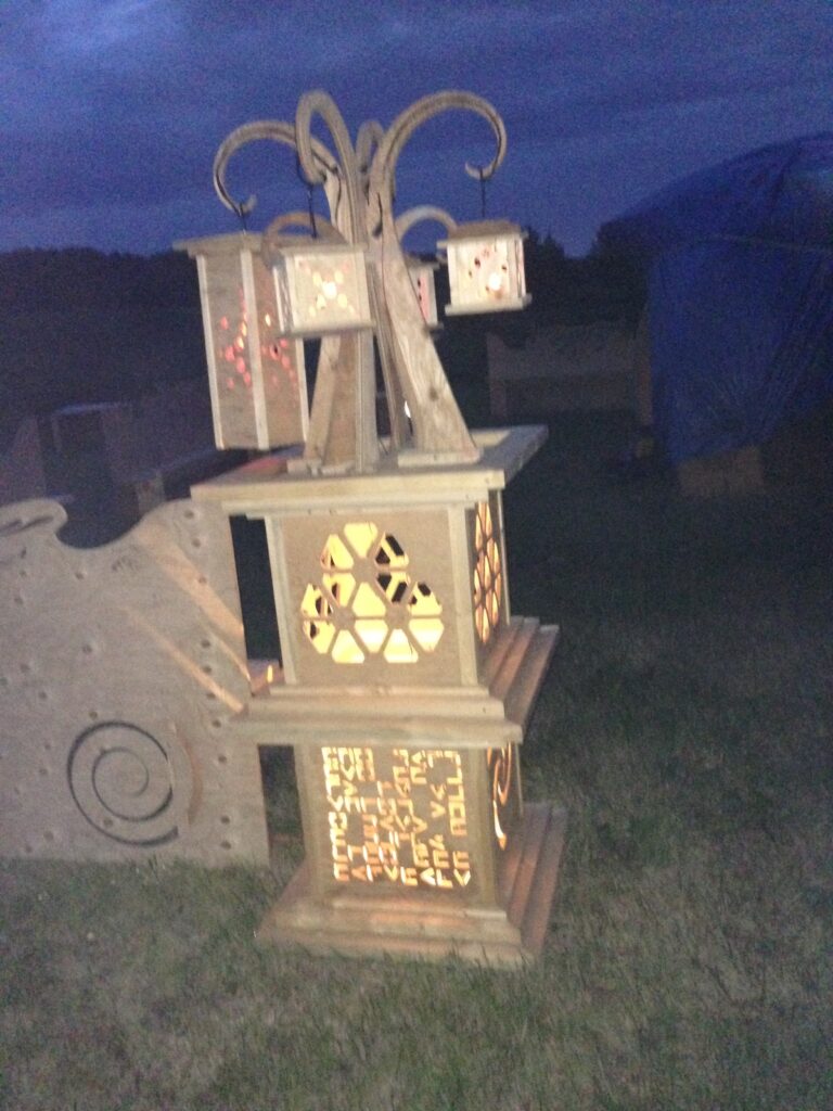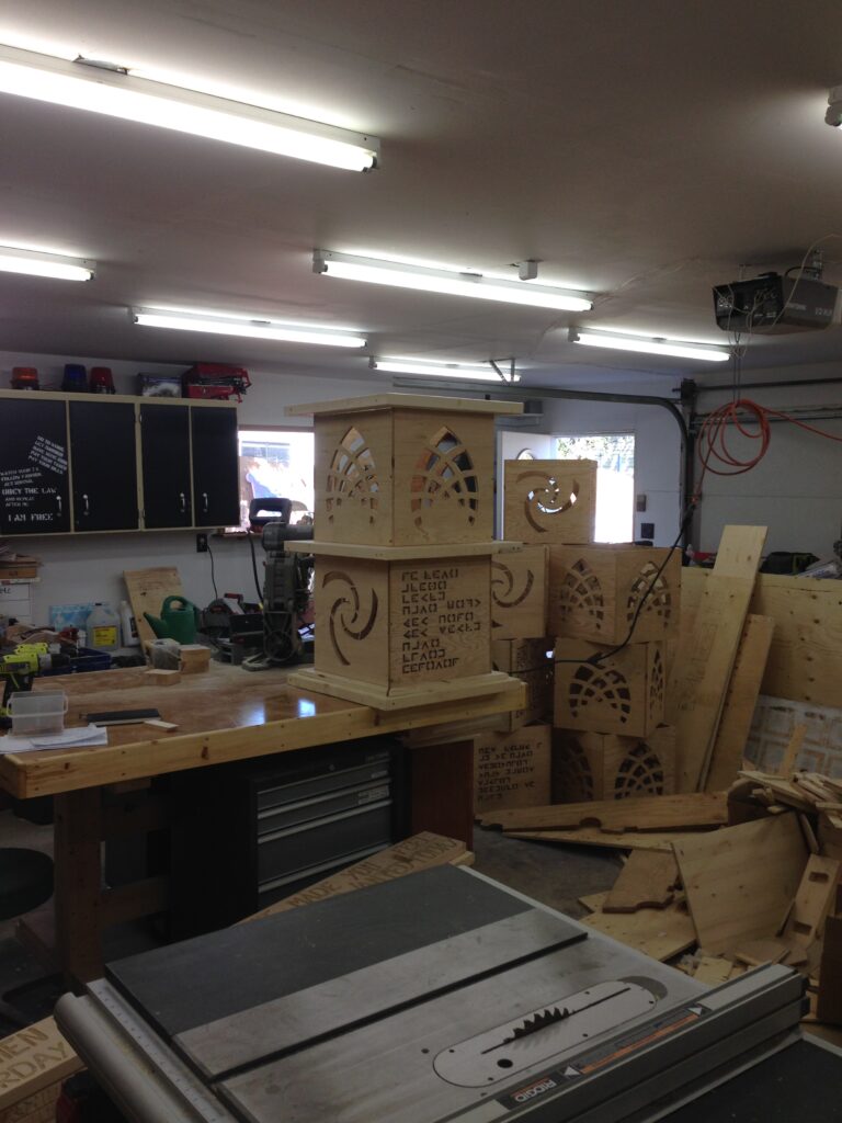 Troy built benches and corner pillars with LED lanterns to surround the main 2015 Freezer Burn Temple built by Justin Miller.