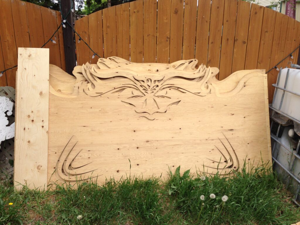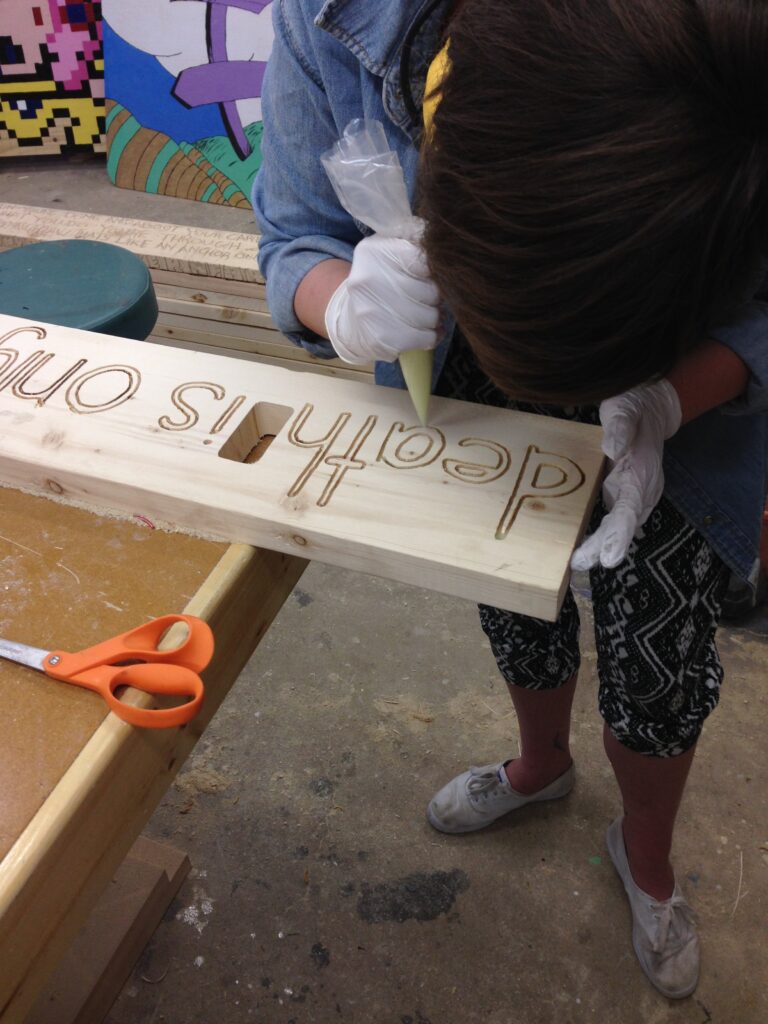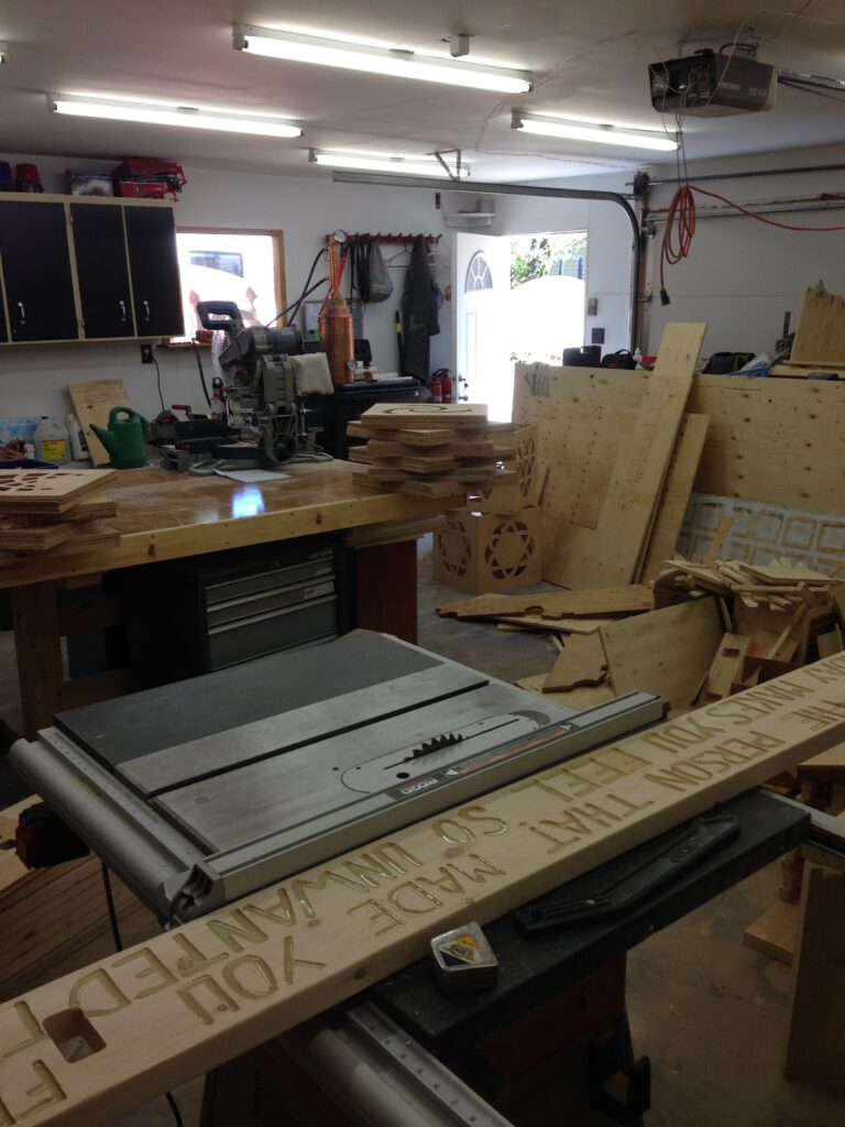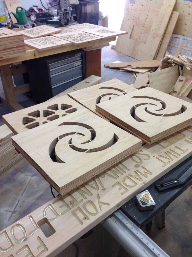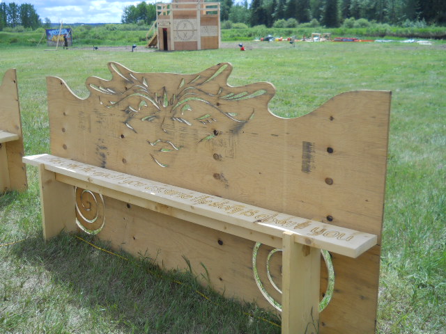 The benches where engraved with quotes and filled with glow-in-the-dark resin, the bench tops were capped with waterjet cut angels and demons.