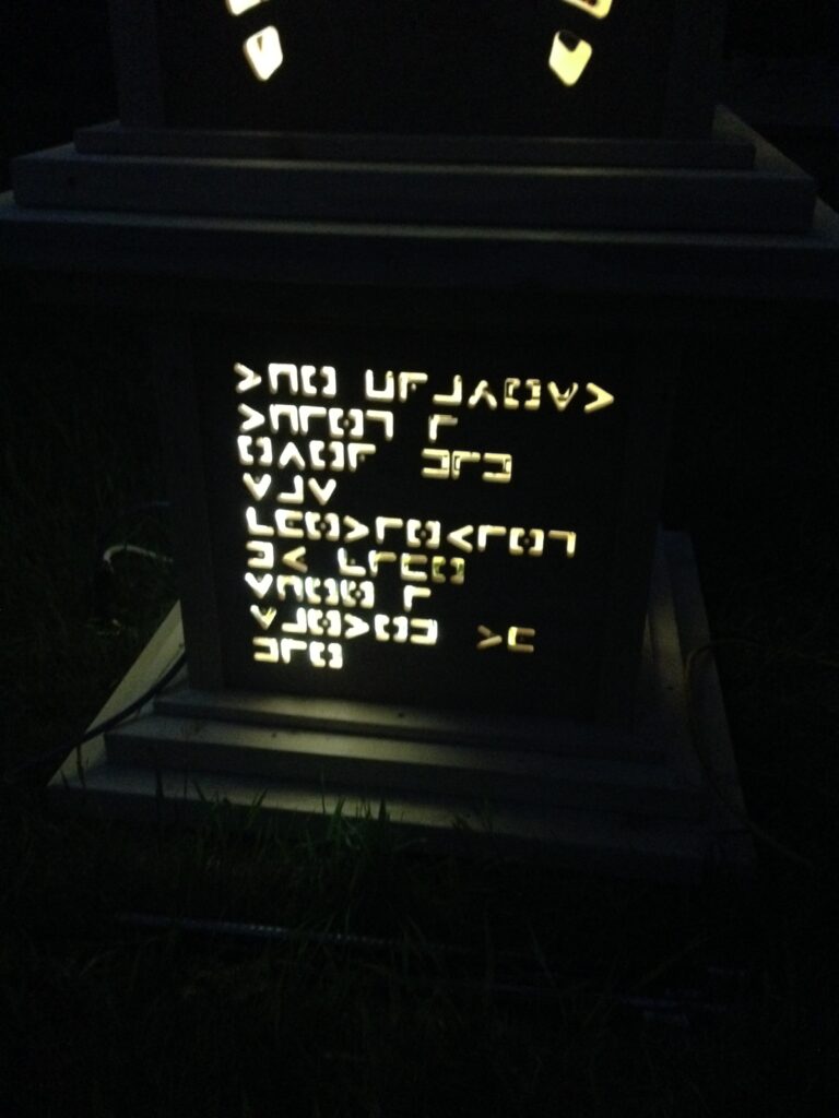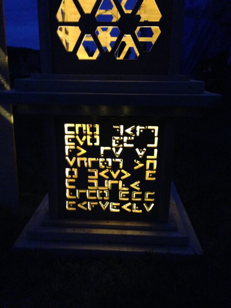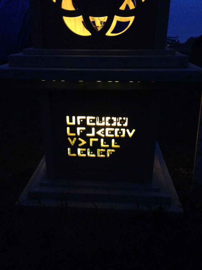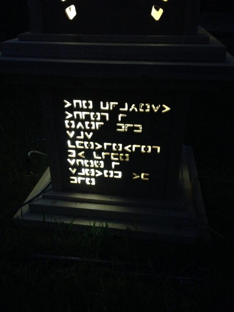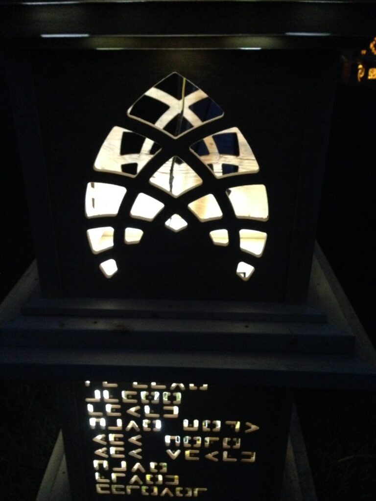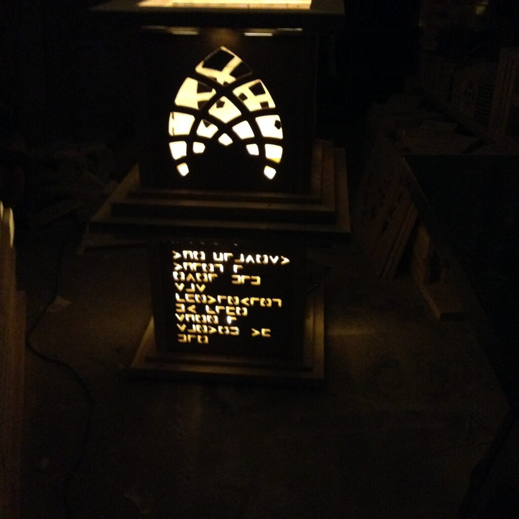 The pillars had different messages coded into their side panels that were cut out by waterjet, topped with flickering LED lanterns.