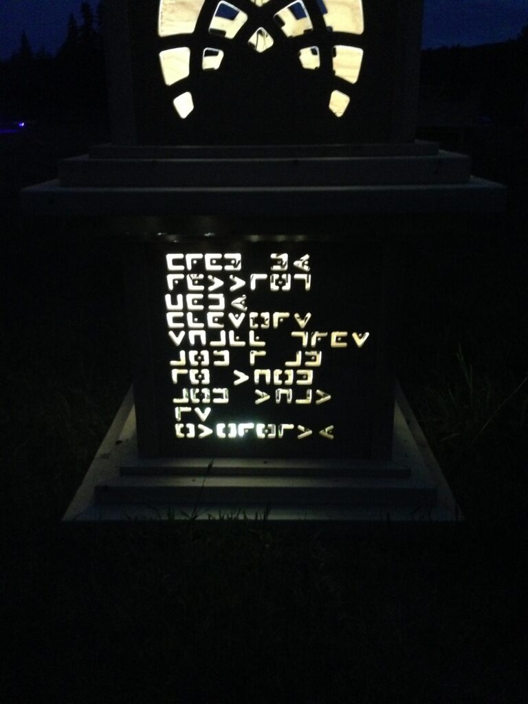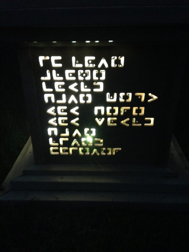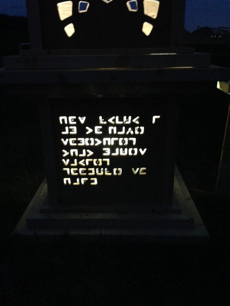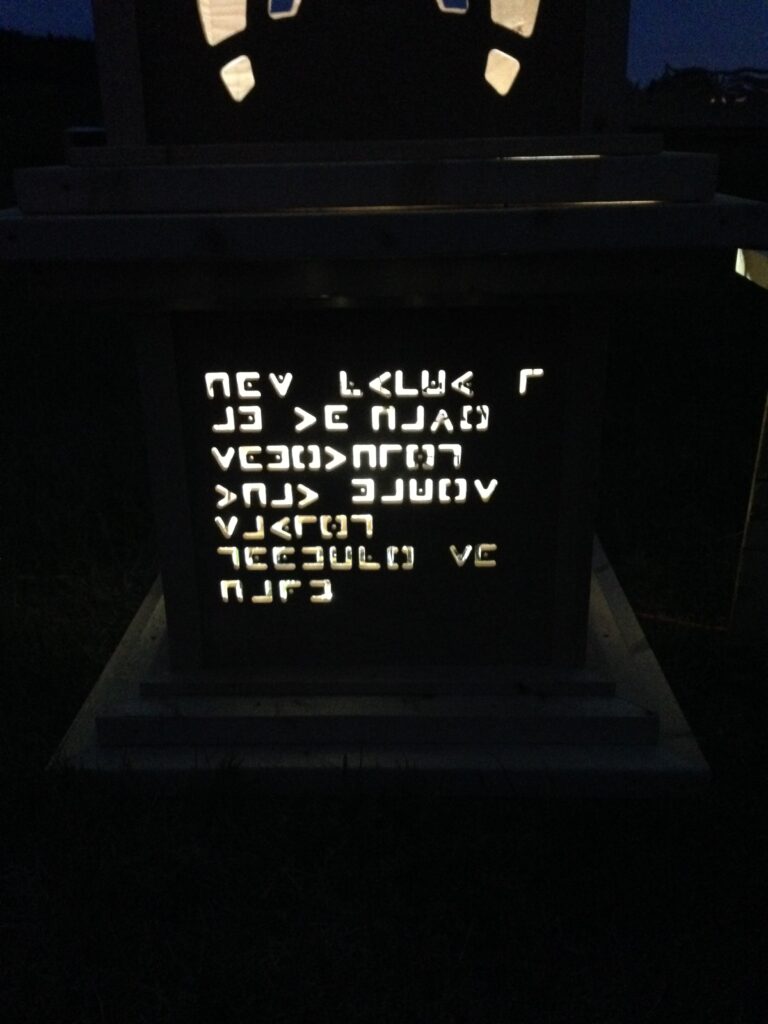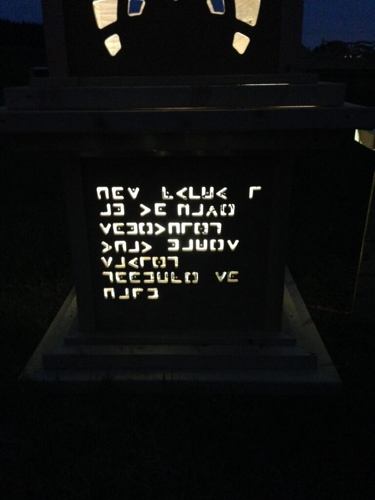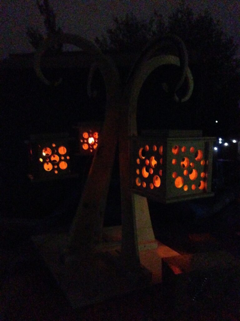 The pillars had different messages coded into their side panels that were cut out by waterjet, topped with flickering LED lanterns.