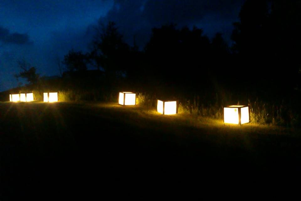 After watching (and laughing) at a number of participants tripping and falling down the rather steep and unlit pathway, Troy slipped and fell down that same pathway. Finding this far less funny as an interactive experience, the light cubes were developed to light the pathway and prevent future incidents.