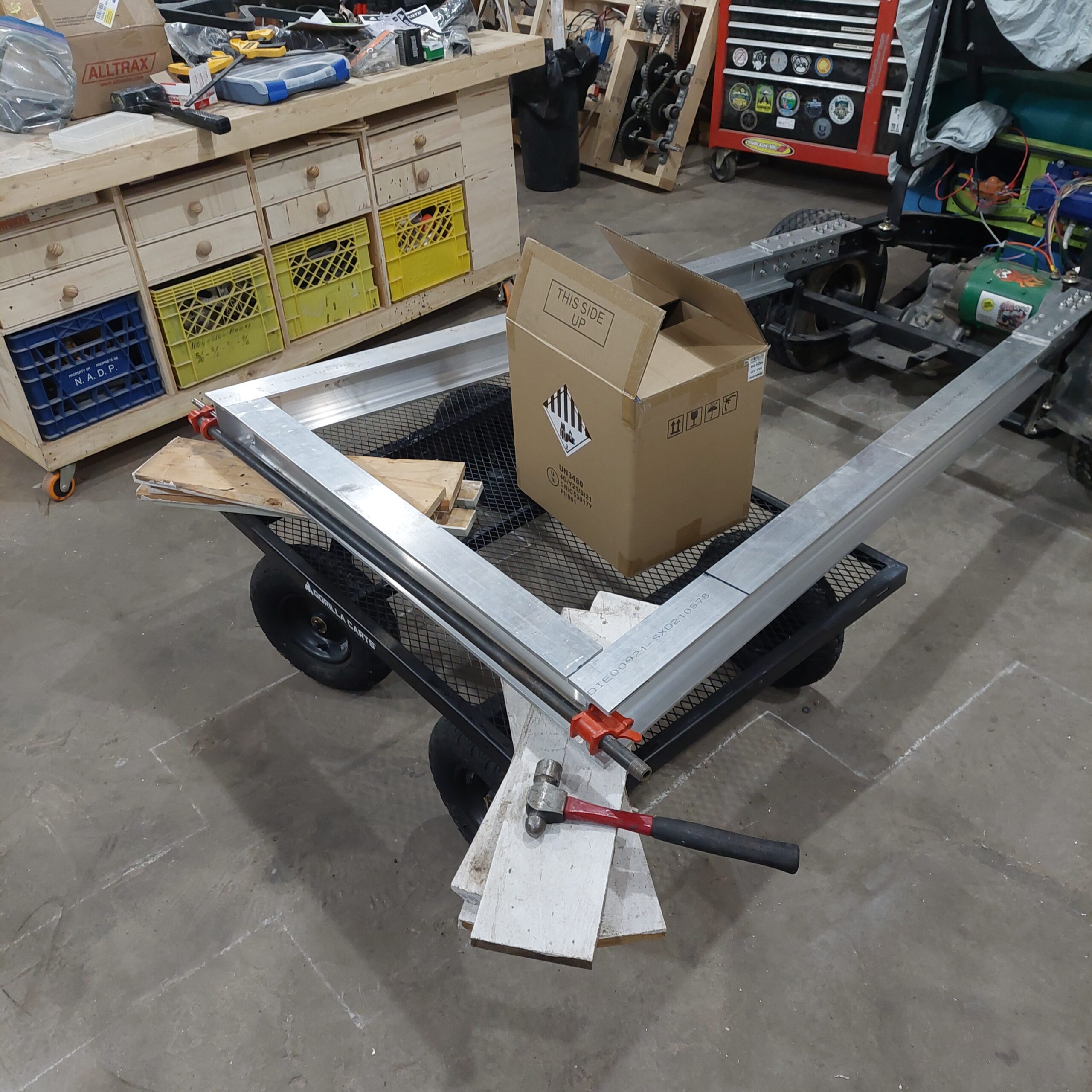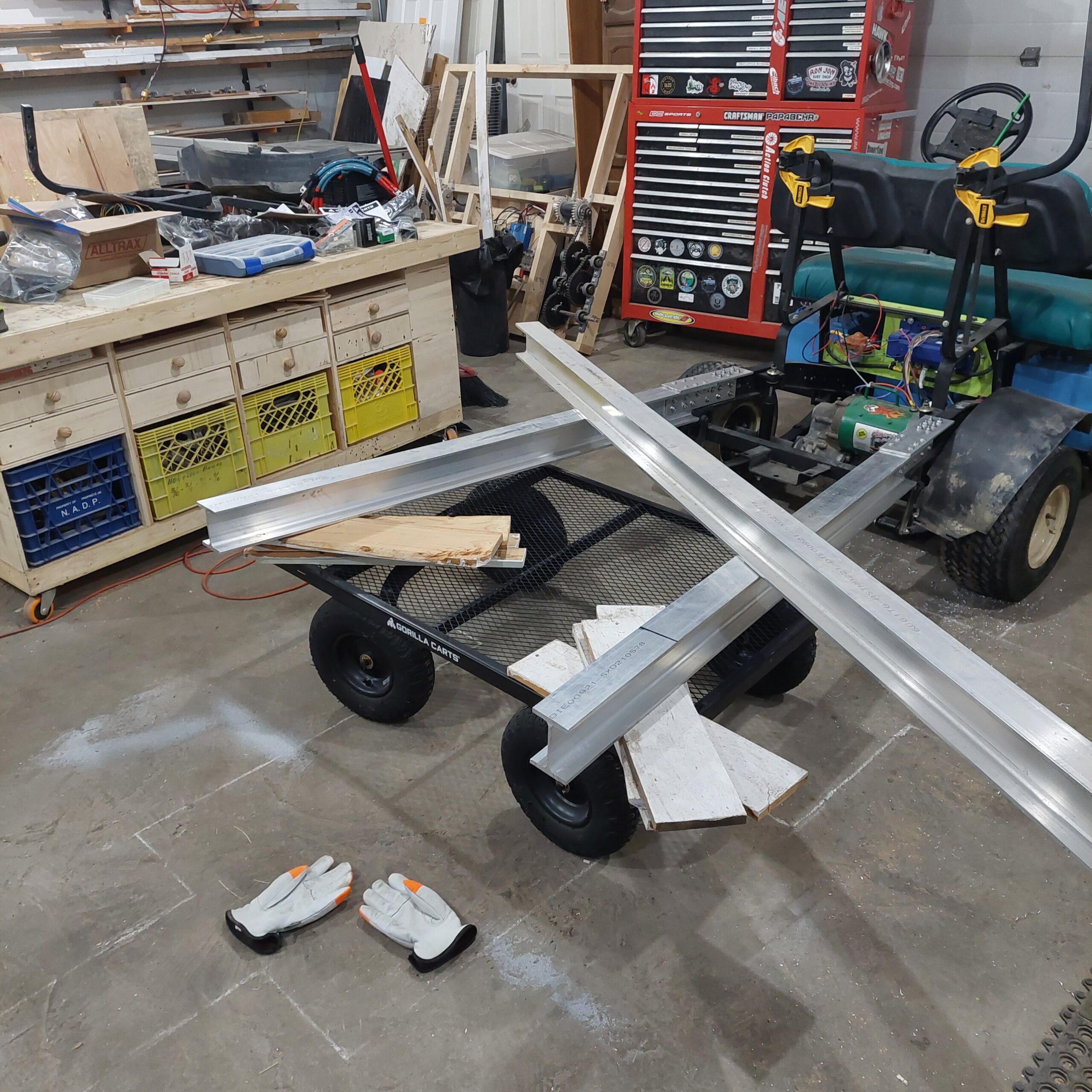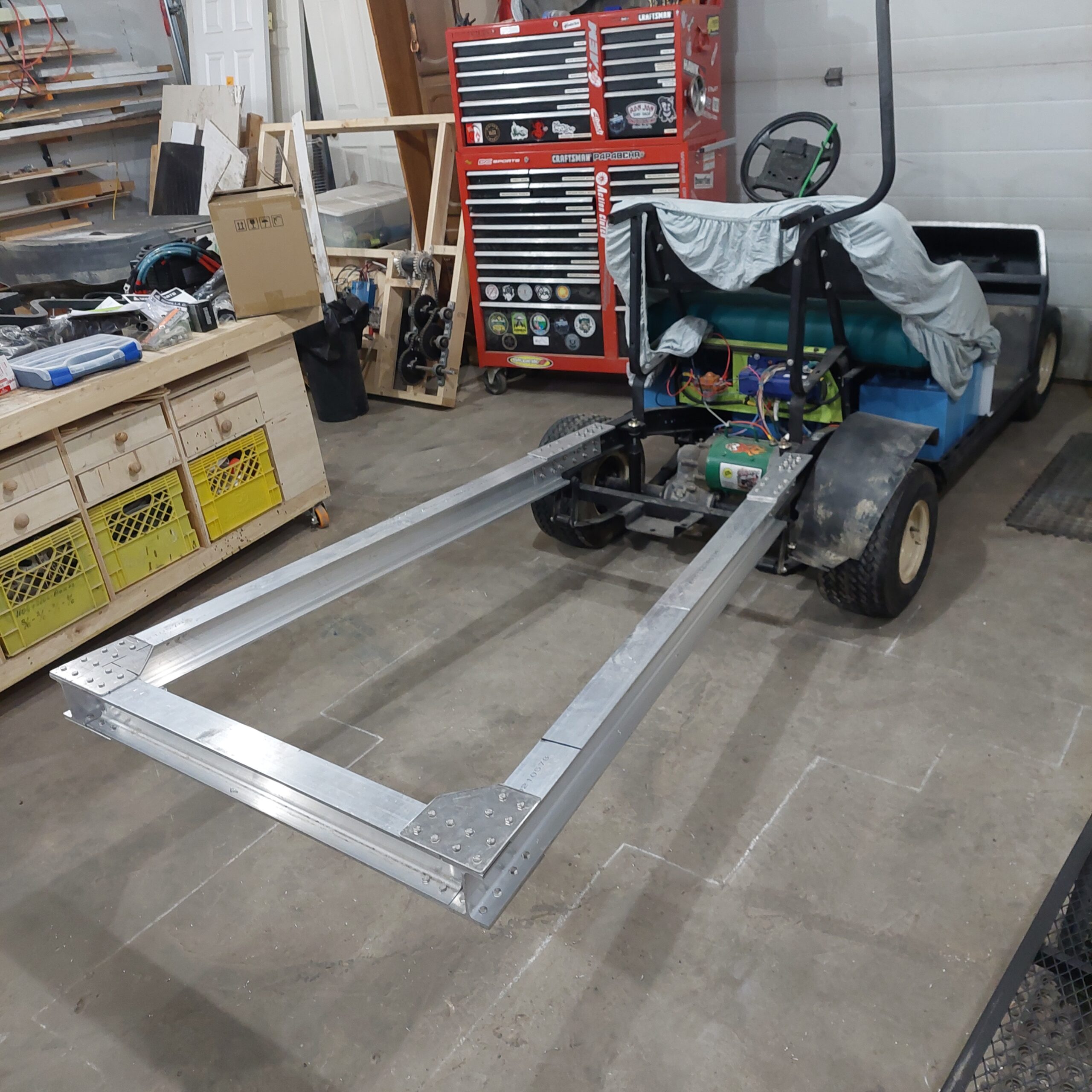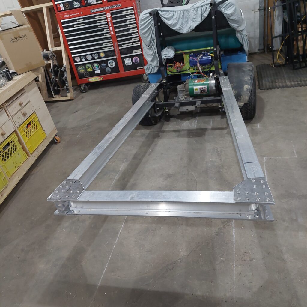 First step after stripping the cart down to a bare frame was to upgrade the suspension, motor, and speed controller. From there we added new lithium iron batteries and extended the existing frame with Aluminum I-Beams to allow us more room for passengers.